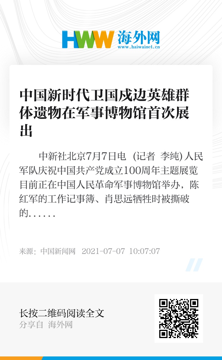 中新社北京7月7日电 (记者 李纯)人民军队庆祝中国共产党成立100周年主题展览目前正在中国人民革命军事博物馆举办,陈红军的工作记事簿、肖思远牺牲时被撕破的棉衣、王焯冉的请战书等“新时代卫国戍边英雄群体”留下的实物、遗物首次与公众见面。