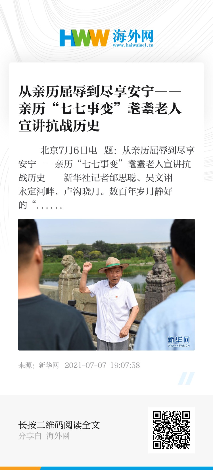 新华社北京7月6日电 题:从亲历屈辱到尽享安宁――亲历“七七事变”耄耋老人宣讲抗战历史