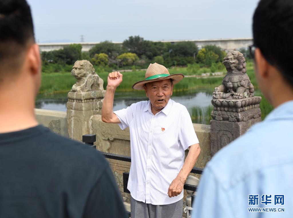 7月5日,郑福来老人在北京卢沟桥为游客讲述抗战历史。新华社记者 张晨霖 摄