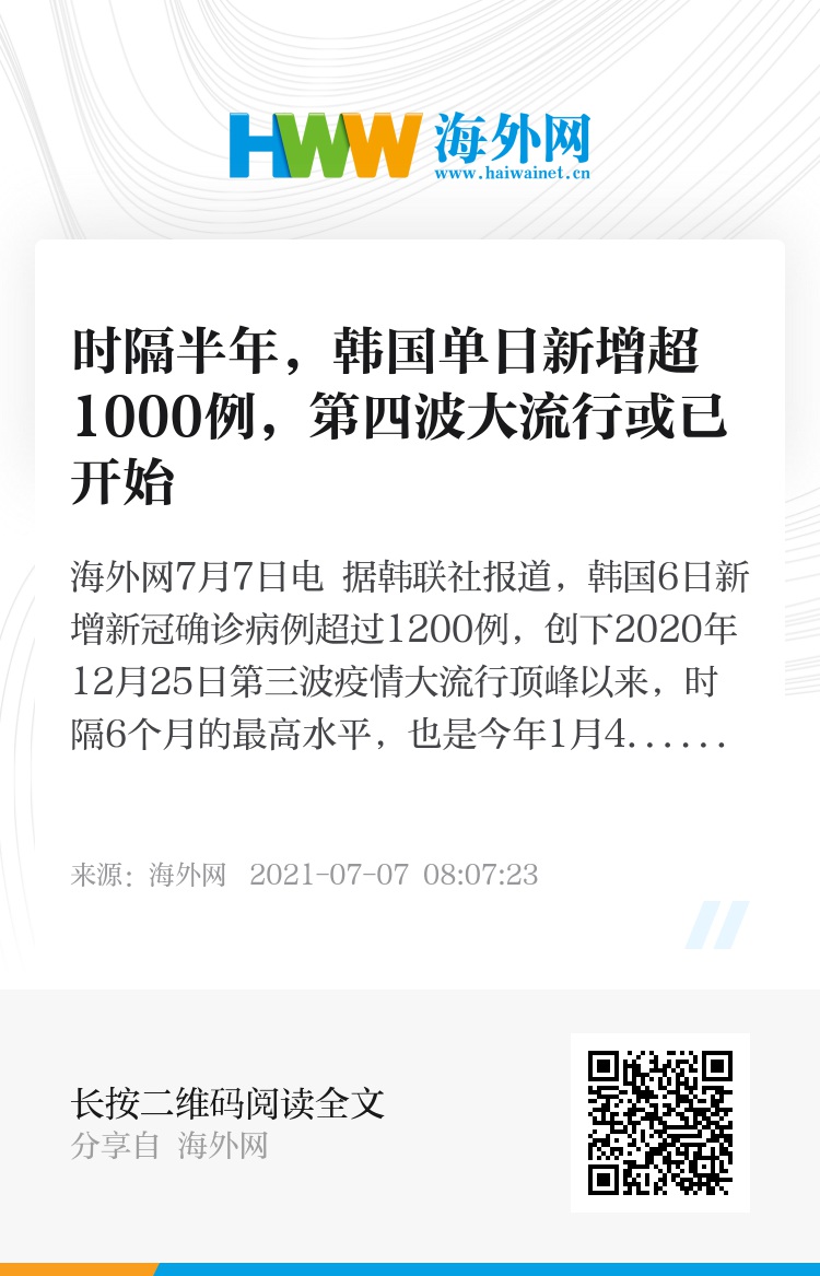 海外网7月7日电 据韩联社报道,韩国6日新增新冠确诊病例超过1200例,创下2020年12月25日第三波疫情大流行顶峰以来,时隔6个月的最高水平,也是今年1月4日以后单日新增病例首次超千。因此舆论担心第四波大流行已经开始。