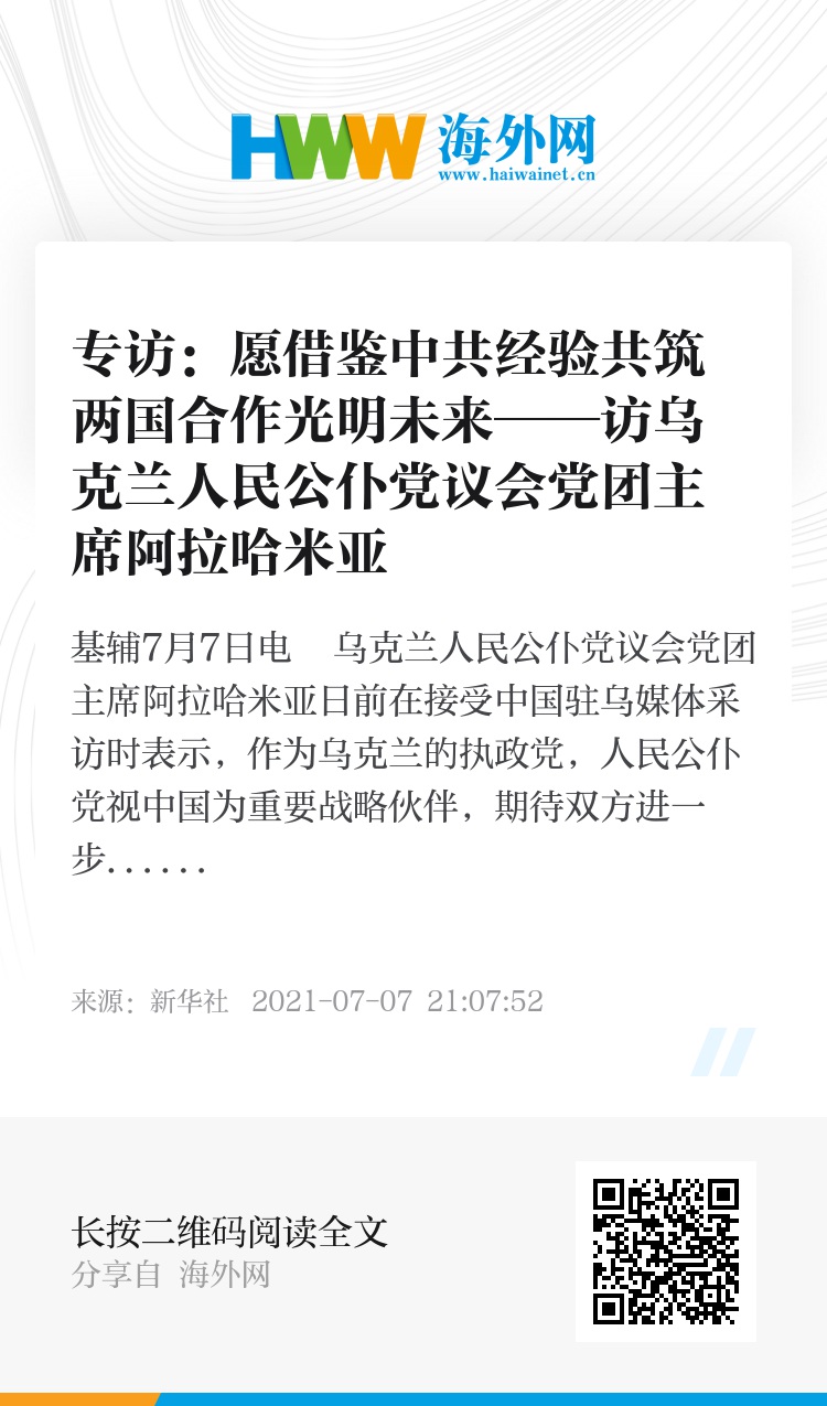 阿拉哈米亚说,今年是中国共产党建党100周年,人民公仆党愿借鉴中国共产党在治国理政方面的成功经验,以此加快乌自身发展。