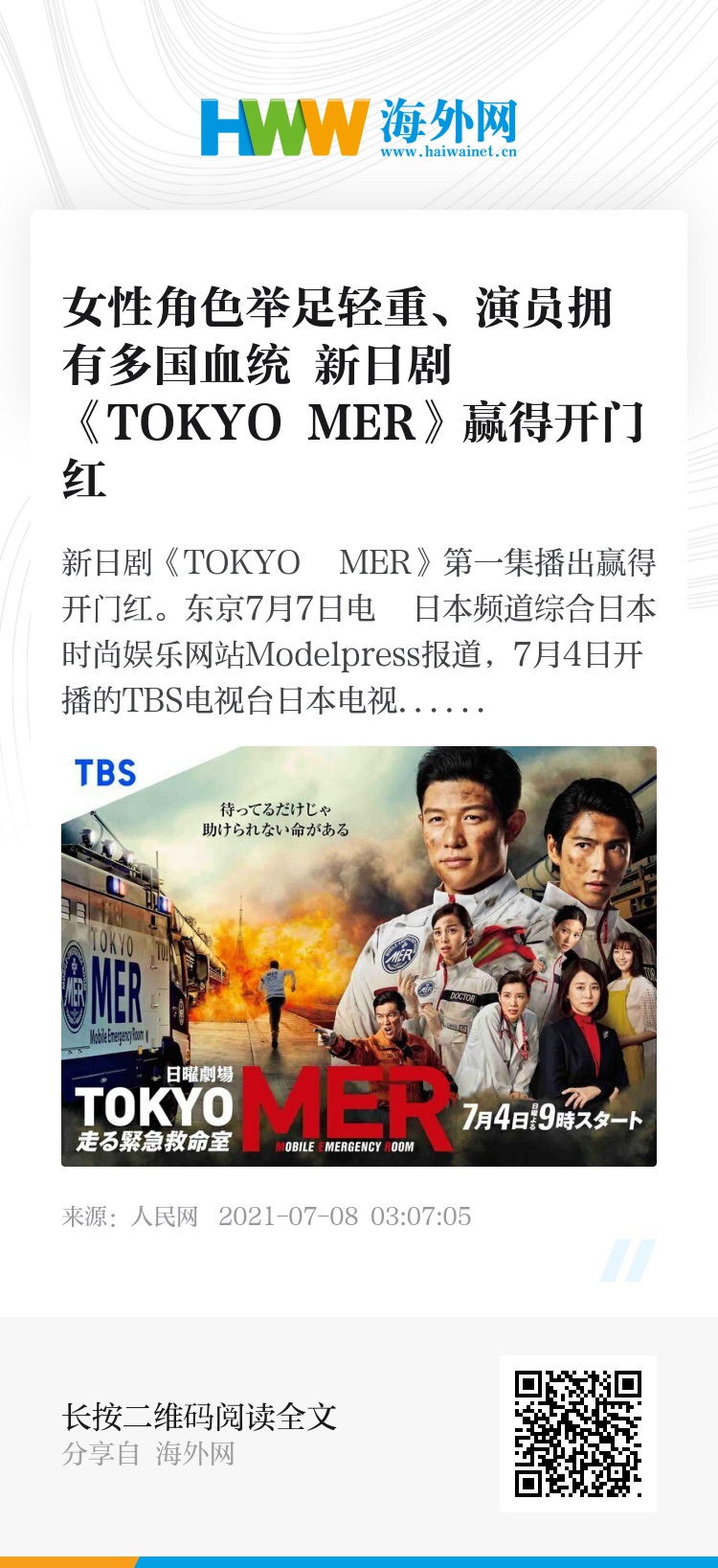 人民网东京7月7日电 日本频道综合日本时尚娱乐网站Modelpress报道,7月4日开播的TBS电视台日本电视剧《TOKYO MER--移动的急救室》的首集收视率高达14.1%,直逼前几天刚刚播完的人气日剧《龙樱2》首播14.8%的记录,势头相当强劲。