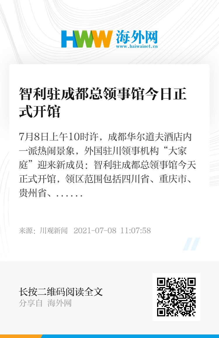 7月8日上午10时许,成都华尔道夫酒店内一派热闹景象,外国驻川领事机构“大家庭”迎来新成员:智利驻成都总领事馆今天正式开馆,领区范围包括四川省、重庆市、贵州省、云南省和陕西省。