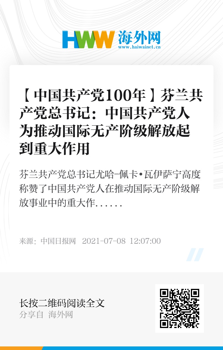 芬兰共产党总书记尤哈-佩卡•瓦伊萨宁高度称赞了中国共产党人在推动国际无产阶级解放事业中的重大作用。他指出:在构建人类命运共同体的倡议指引下,世界上的马克思主义者与工人阶级一道为了改变世界而奋斗。中国共产党使得世界共产党人与工人阶级的联系大大加强了,芬兰共产党对此向中国共产党表达敬意。