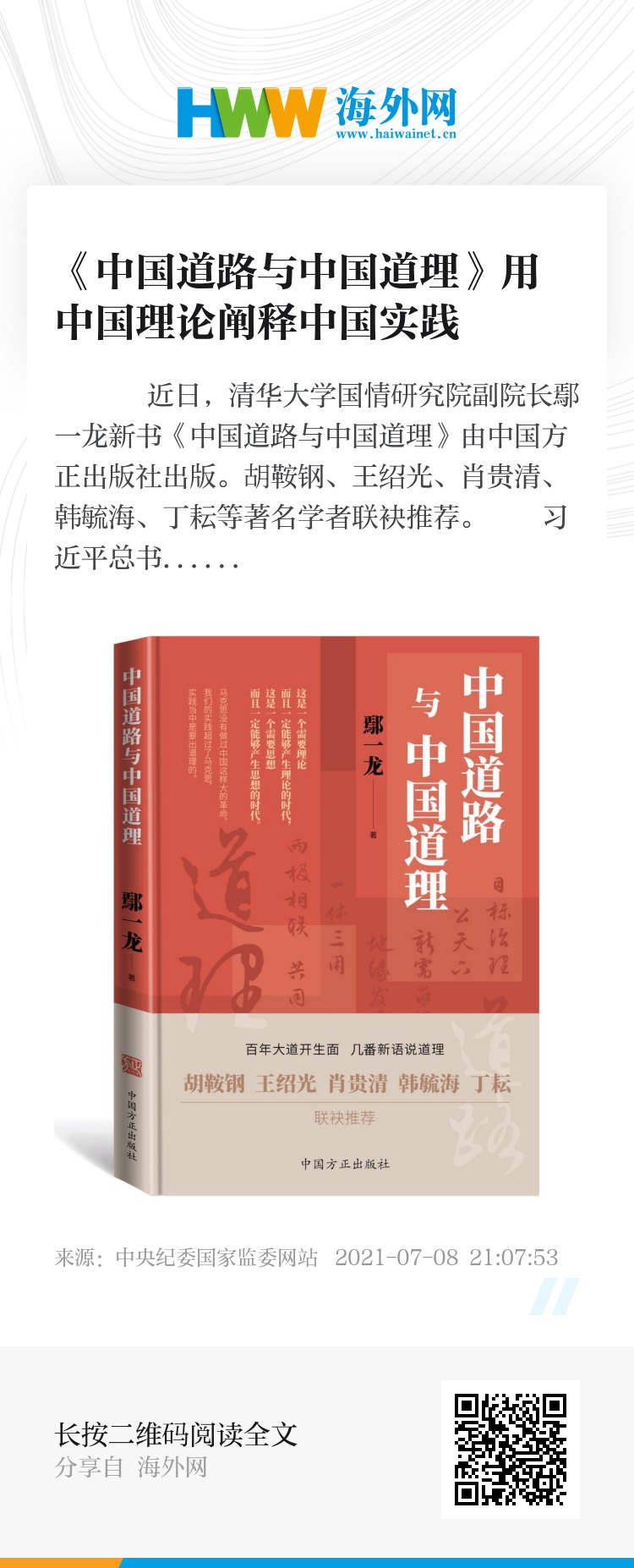 近日,清华大学国情研究院副院长鄢一龙新书《中国道路与中国道理》由中国方正出版社出版。胡鞍钢、王绍光、肖贵清、韩毓海、丁耘等著名学者联袂推荐。