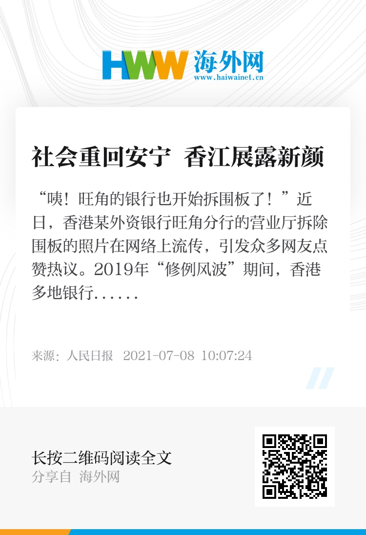 2019年“修例风波”期间,香港多地银行及商铺遭暴徒打砸纵火,旺角是重灾区。银行为加强安全,不得不立起围板防范暴徒冲击。如今,旺角的银行得以拆除围板、正常运营,不少市民感叹,“连银行也安心拆板,香港真的安全了”“幸好有国安法”……