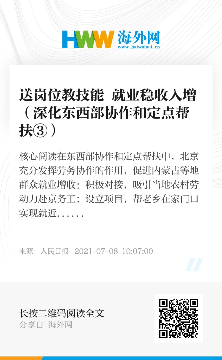 在东西部协作和定点帮扶中,北京充分发挥劳务协作的作用,促进内蒙古等地群众就业增收:积极对接,吸引当地农村劳动力赴京务工;设立项目,帮老乡在家门口实现就近就业;开展培训,助乡亲们掌握一技之长……一系列举措拓宽了就业渠道,夯实了群众稳定增收的基础。