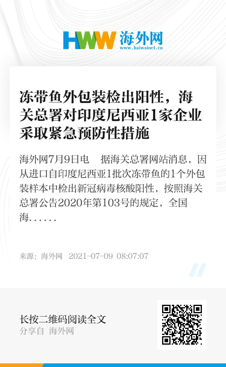 海外网7月9日电 据海关总署网站消息,因从进口自印度尼西亚1批次冻带鱼的1个外包装样本中检出新冠病毒核酸阳性,按照海关总署公告2020年第103号的规定,全国海关自即日起暂停接受印度尼西亚水产品生产企业PT. NAGA LAUT BERSINAR(注册编号为CR 791-12)的进口申报1周。