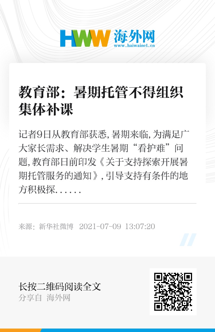 记者9日从教育部获悉,暑期来临,为满足广大家长需求、解决学生暑期“看护难”问题,教育部日前印发《关于支持探索开展暑期托管服务的通知》,引导支持有条件的地方积极探索开展暑期托管服务工作。通知指出,暑期托管要坚持自愿,不得强制,对志愿参与的教师应给予适当补助。通知要求,暑期托管服务内容,应以看护为主,开放教室、图书馆、运动场馆等资源设施,合理组织提供一些集体游戏活动、文体活动、阅读指导、综合实践、兴趣拓展、作业辅导等服务,不得组织集体补课、讲授新课。(记者余俊杰)