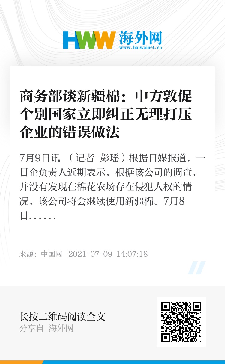 中国网7月9日讯 (记者 彭瑶)根据日媒报道,一日企负责人近期表示,根据该公司的调查,并没有发现在棉花农场存在侵犯人权的情况,该公司将会继续使用新疆棉。7月8日,商务部新闻发言人高峰在商务部例行新闻发布会上表示,所谓新疆“强迫劳动”问题完全违背事实,中方敦促个别国家立即纠正无理打压企业的错误做法。
