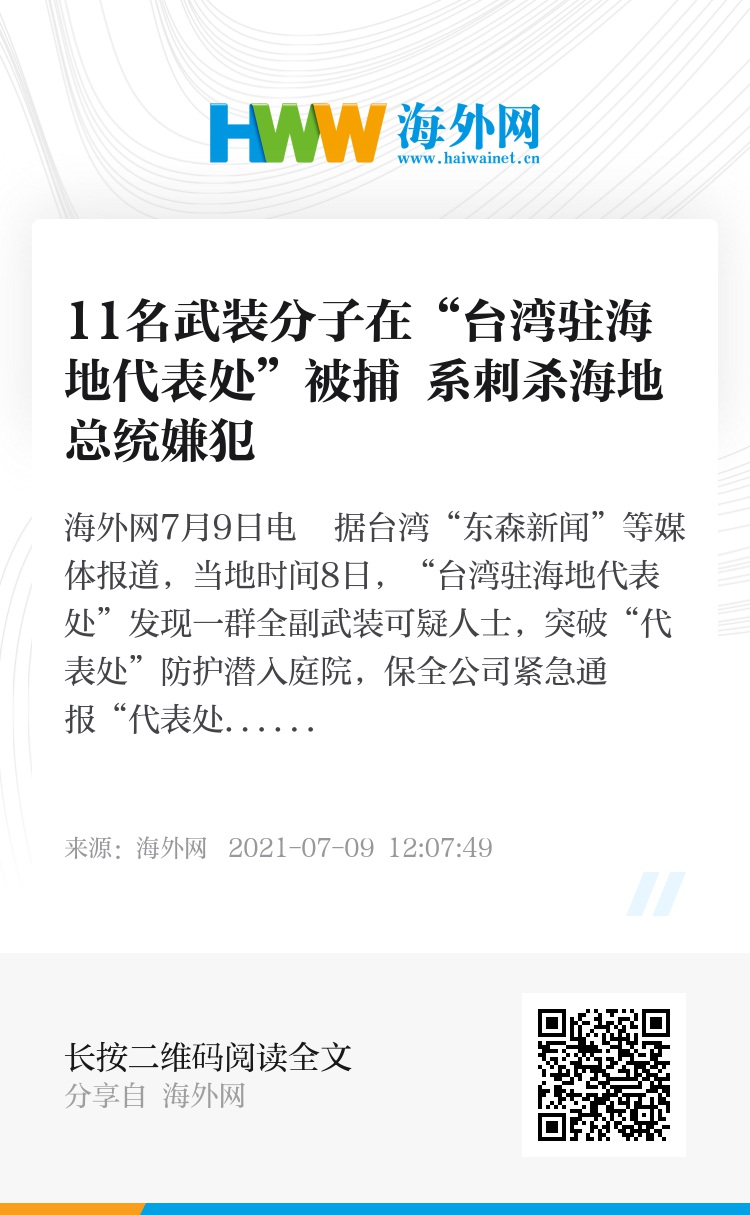 海外网7月9日电 据台湾“东森新闻”等媒体报道,当地时间8日,“台湾驻海地代表处”发现一群全副武装可疑人士,突破“代表处”防护潜入庭院,保全公司紧急通报“代表处”及海地警方,逮捕11名武装嫌犯,并已由海地警方带回侦讯。台媒称,涉及刺杀海地总统一案的28名嫌犯中,就包括这11人。