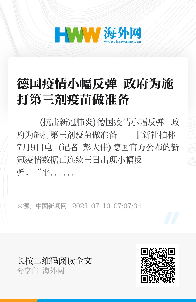 中新社柏林7月9日电 (记者 彭大伟)德国官方公布的新冠疫情数据已连续三日出现小幅反弹,“平均每十万人七日累计新增确诊感染新冠病毒病例数”9日当天升至5.5。德国联邦政府发言人赛贝特当天表示,德国联邦政府和各州正在为施打被称为“加强针”的第三针疫苗做必要准备。