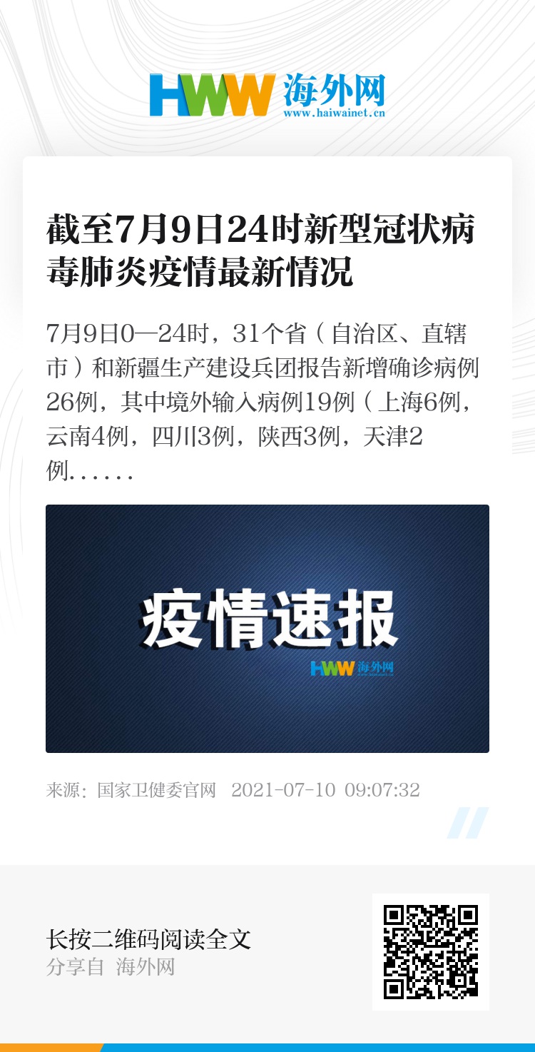 7月9日0—24时,31个省(自治区、直辖市)和新疆生产建设兵团报告新增确诊病例26例,其中境外输入病例19例(上海6例,云南4例,四川3例,陕西3例,天津2例,广东1例),本土病例7例(均在云南);无新增死亡病例;新增疑似病例2例,均为境外输入病例(均在上海)。