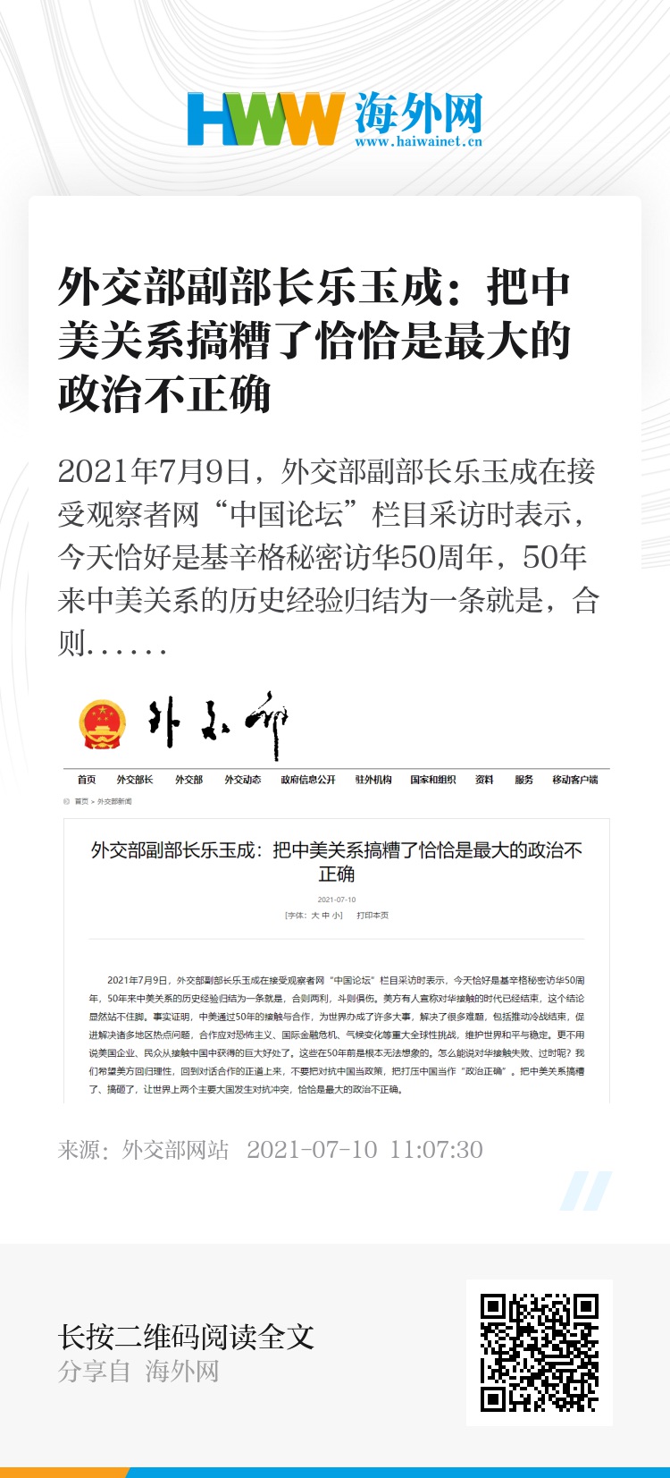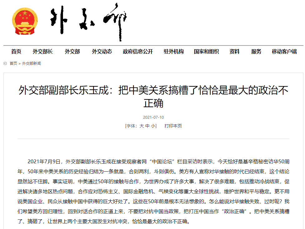 2021年7月9日,外交部副部长乐玉成在接受观察者网“中国论坛”栏目采访时表示,今天恰好是基辛格秘密访华50周年,50年来中美关系的历史经验归结为一条就是,合则两利,斗则俱伤。美方有人宣称对华接触的时代已经结束,这个结论显然站不住脚。事实证明,中美通过50年的接触与合作,为世界办成了许多大事,解决了很多难题,包括推动冷战结束,促进解决诸多地区热点问题,合作应对恐怖主义、国际金融危机、气候变化等重大全球性挑战,维护世界和平与稳定。更不用说美国企业、民众从接触中国中获得的巨大好处了。这些在50年前是根本无法想象的。怎么能说对华接触失败、过时呢?我们希望美方回归理性,回到对话合作的正道上来,不要把对抗中国当政策,把打压中国当作“政治正确”。把中美关系搞糟了、搞砸了,让世界上两个主要大国发生对抗冲突,恰恰是最大的政治不正确。
