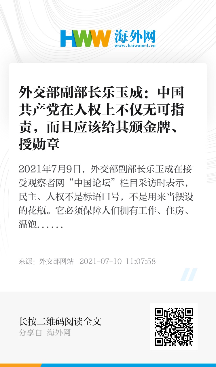 2021年7月9日,外交部副部长乐玉成在接受观察者网“中国论坛”栏目采访时表示,民主、人权不是标语口号,不是用来当摆设的花瓶。它必须保障人们拥有工作、住房、温饱、受教育、医疗、养老等基本人权。药好不好,不能看广告,而要看疗效。中国共产党百年奋斗历程所取得的辉煌治理成就就是最成功的民主、最有说服力的民主。中国共产党领导14亿中国人民摆脱千年贫困,过上幸福生活,就是最大的人权、最好的人权。可以说中国共产党在人权问题上不仅无可指责,而且应该给其颁金牌、授勋章。