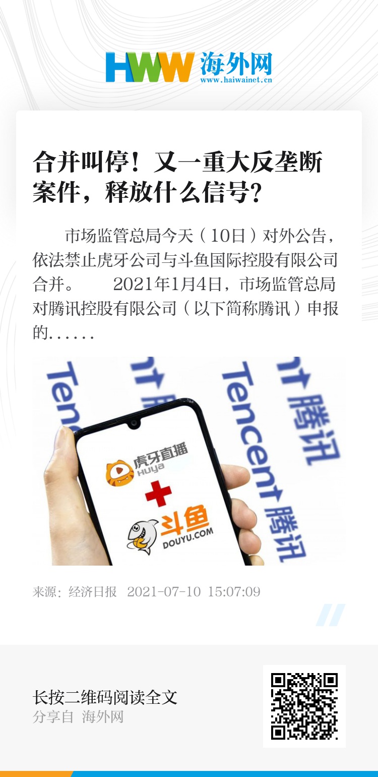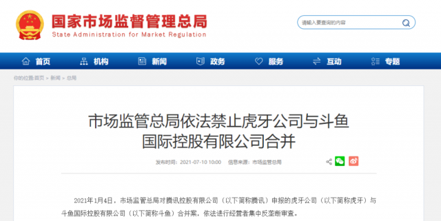 2021年1月4日,市场监管总局对腾讯控股有限公司(以下简称腾讯)申报的虎牙公司(以下简称虎牙)与斗鱼国际控股有限公司(以下简称斗鱼)合并案,依法进行经营者集中反垄断审查。