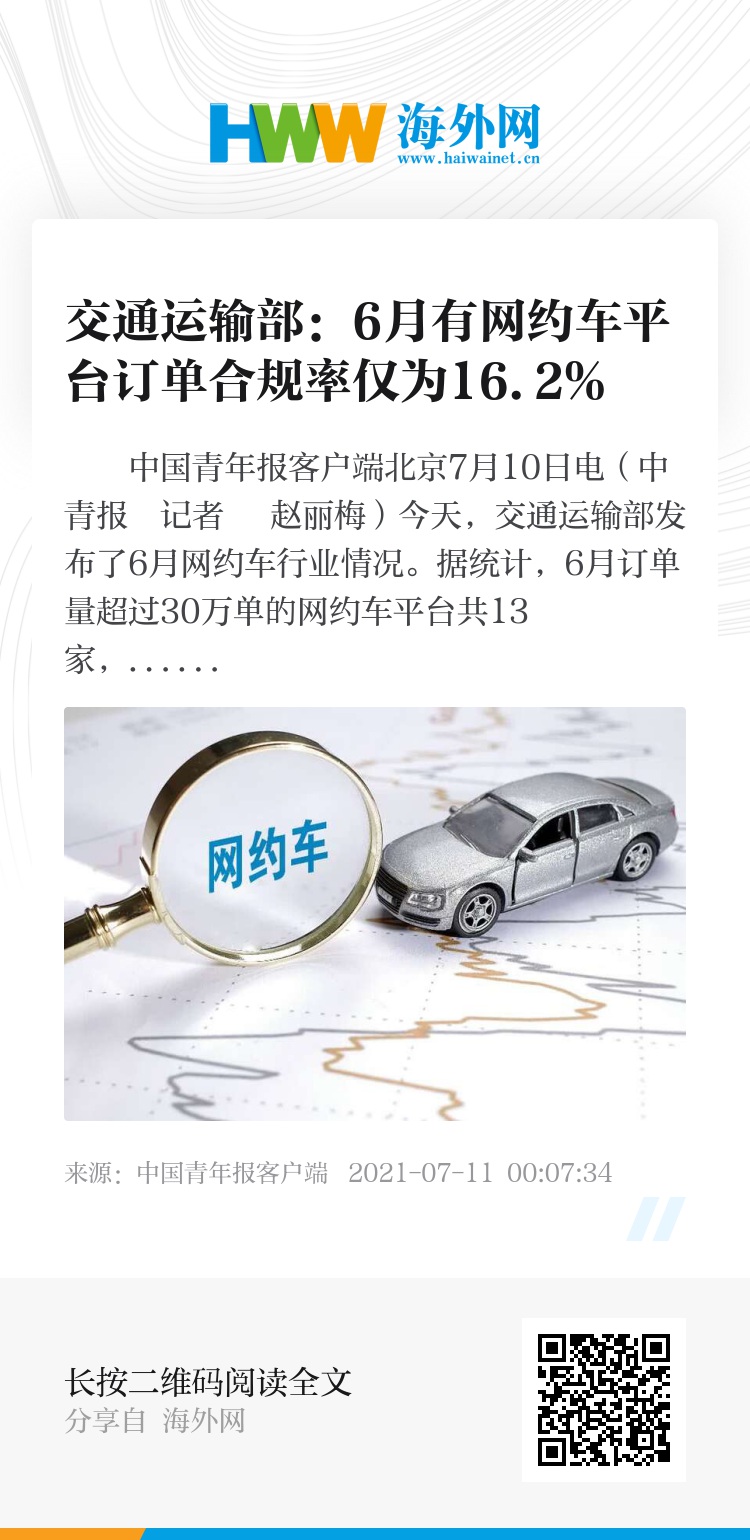 中国青年报客户端北京7月10日电(中青报・中青网记者 赵丽梅)今天,交通运输部发布了6月网约车行业情况。据统计,6月订单量超过30万单的网约车平台共13家,在这13家中,方舟行平台的订单合规率(指驾驶员和车辆均获得许可的订单量占比)最低,仅为16.2%。