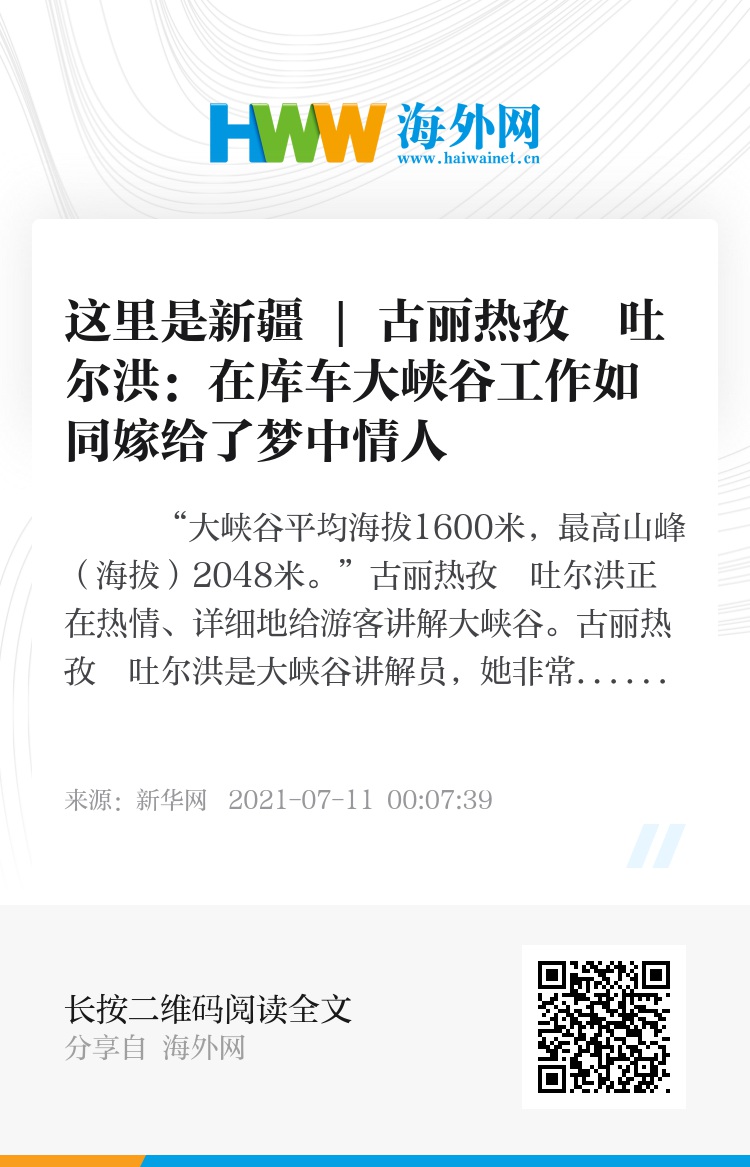 “大峡谷平均海拔1600米,最高山峰(海拔)2048米。”古丽热孜・吐尔洪正在热情、详细地给游客讲解大峡谷。古丽热孜・吐尔洪是大峡谷讲解员,她非常喜欢这份工作,她说能找到这份工作就如同嫁给了自己的梦中情人。她努力宣传,让更多人认识大峡谷,了解美丽的库车市。古丽热孜・吐尔洪希望新疆库车市日新月异的变化走进更多人的视野。