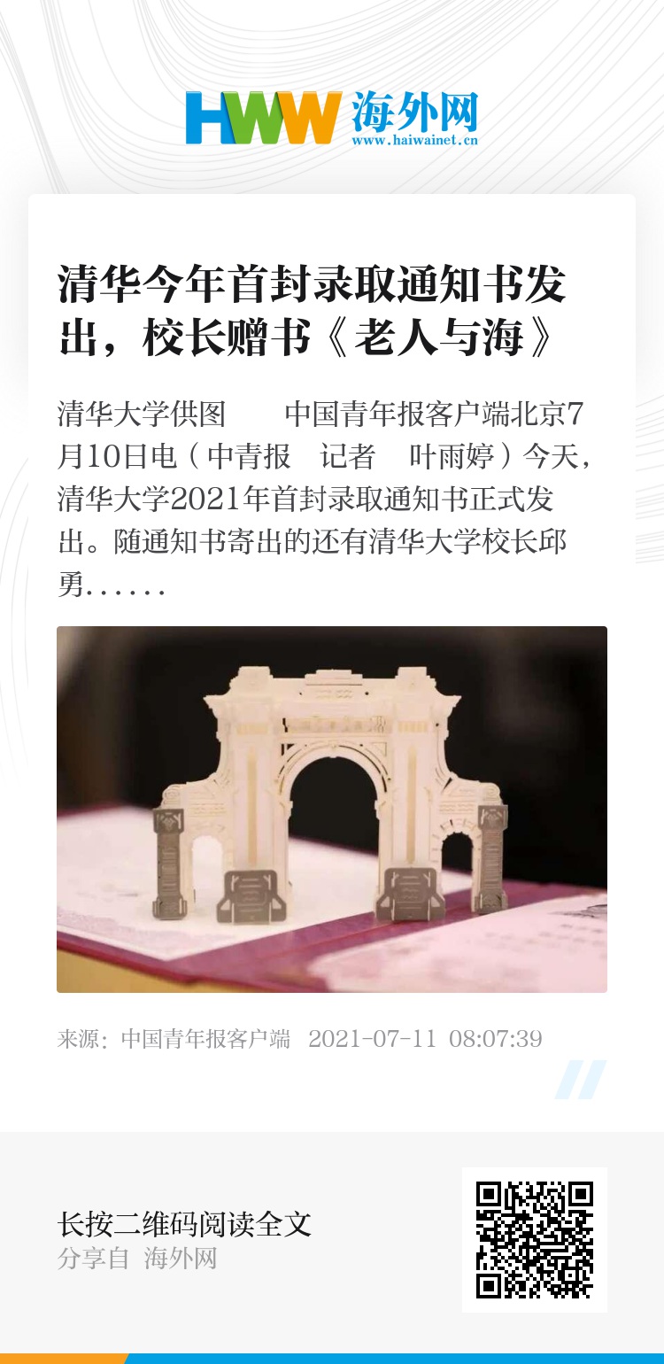 中国青年报客户端北京7月10日电(中青报・中青网记者 叶雨婷)今天,清华大学2021年首封录取通知书正式发出。随通知书寄出的还有清华大学校长邱勇院士给新生的赠书《老人与海》以及致新生的信,寄语新生“塑造坚韧精神 磨砺勇毅品质”。