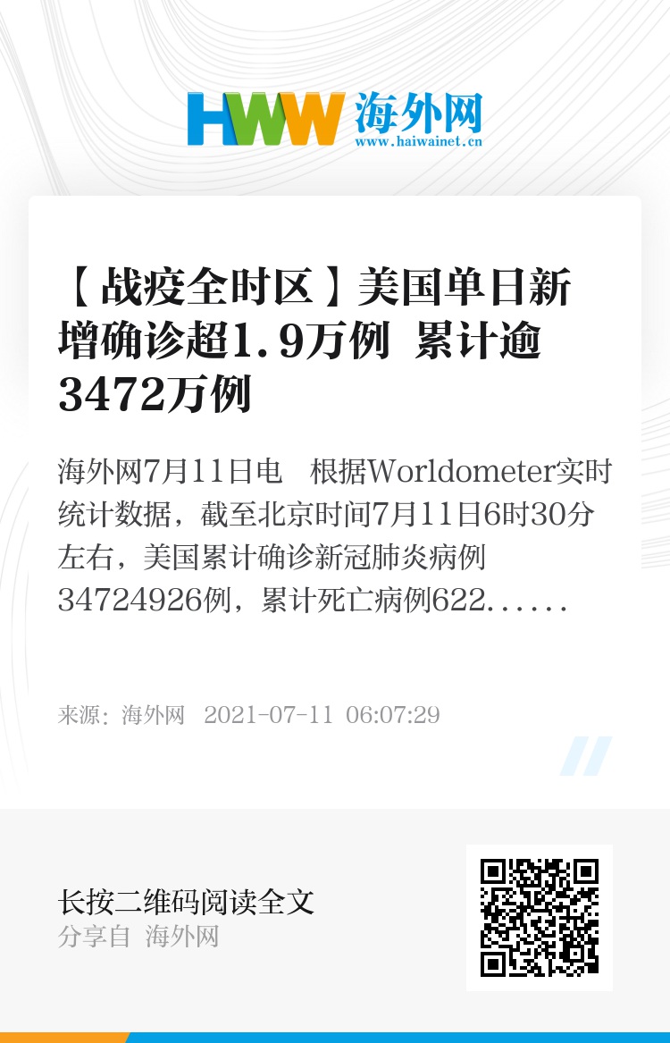 32156185,.【战疫全时区】美国单日新增确诊超1.9万例 累计逾3472万例,.2021-07-11 06:31:29,.204008,.姚凯红、安再尔江•艾合买提