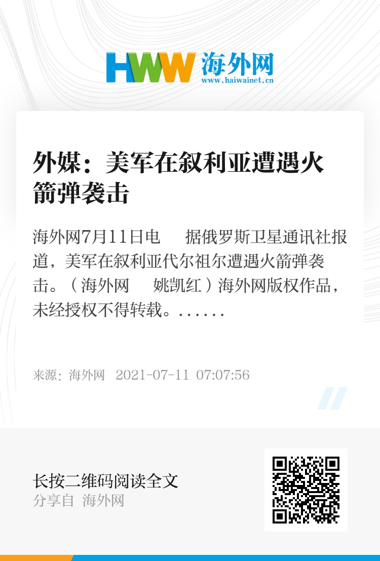 海外网7月11日电 据俄罗斯卫星通讯社报道,美军在叙利亚代尔祖尔遭遇火箭弹袭击。(海外网 姚凯红)