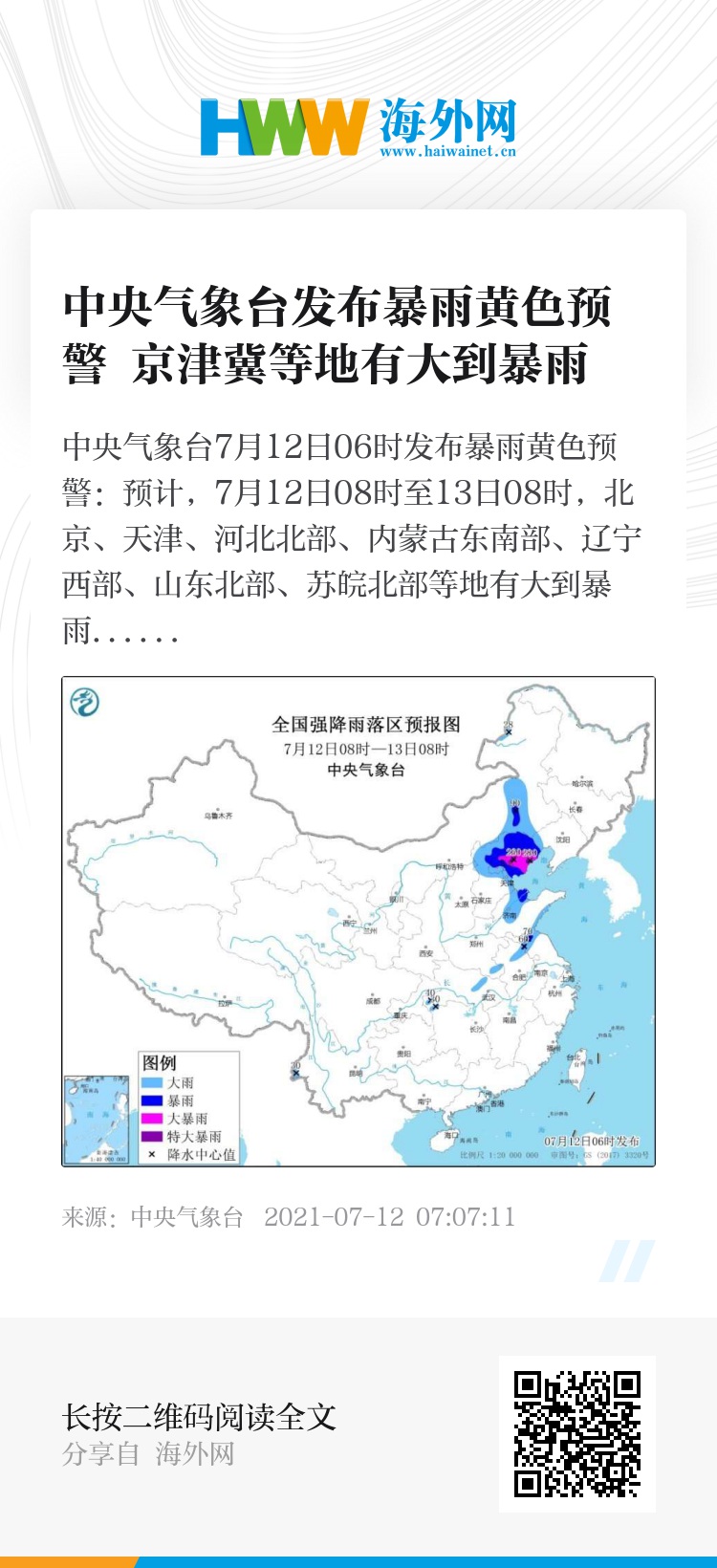 中央气象台7月12日06时发布暴雨黄色预警: