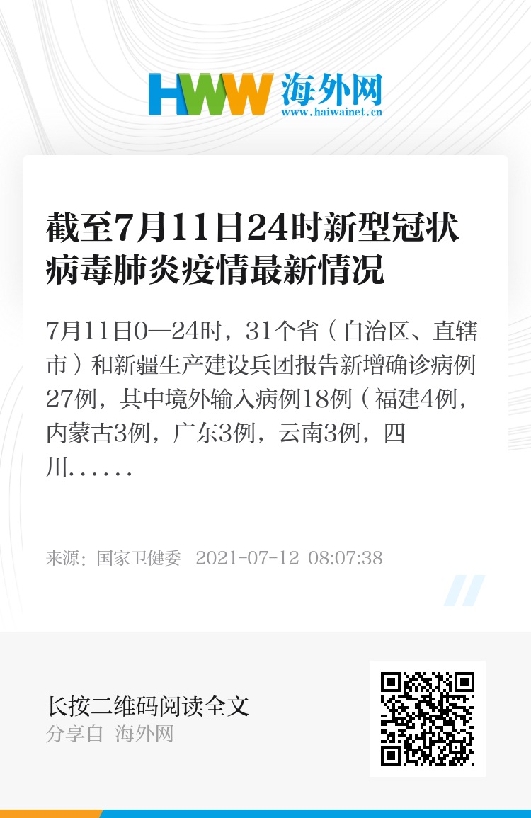 7月11日0—24时,31个省(自治区、直辖市)和新疆生产建设兵团报告新增确诊病例27例,其中境外输入病例18例(福建4例,内蒙古3例,广东3例,云南3例,四川2例,上海1例,江苏1例,河南1例),本土病例9例(均在云南);无新增死亡病例;新增疑似病例1例,为境外输入病例(在上海)。