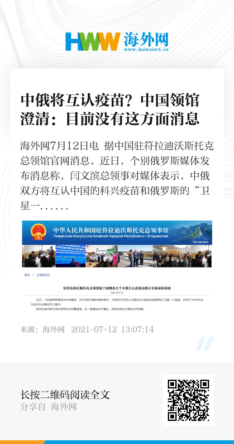 海外网7月12日电 据中国驻符拉迪沃斯托克总领馆官网消息,近日,个别俄罗斯媒体发布消息称,闫文滨总领事对媒体表示,中俄双方将互认中国的科兴疫苗和俄罗斯的“卫星一V”疫苗,并将于今年9月东方经济论坛期间予以宣布。