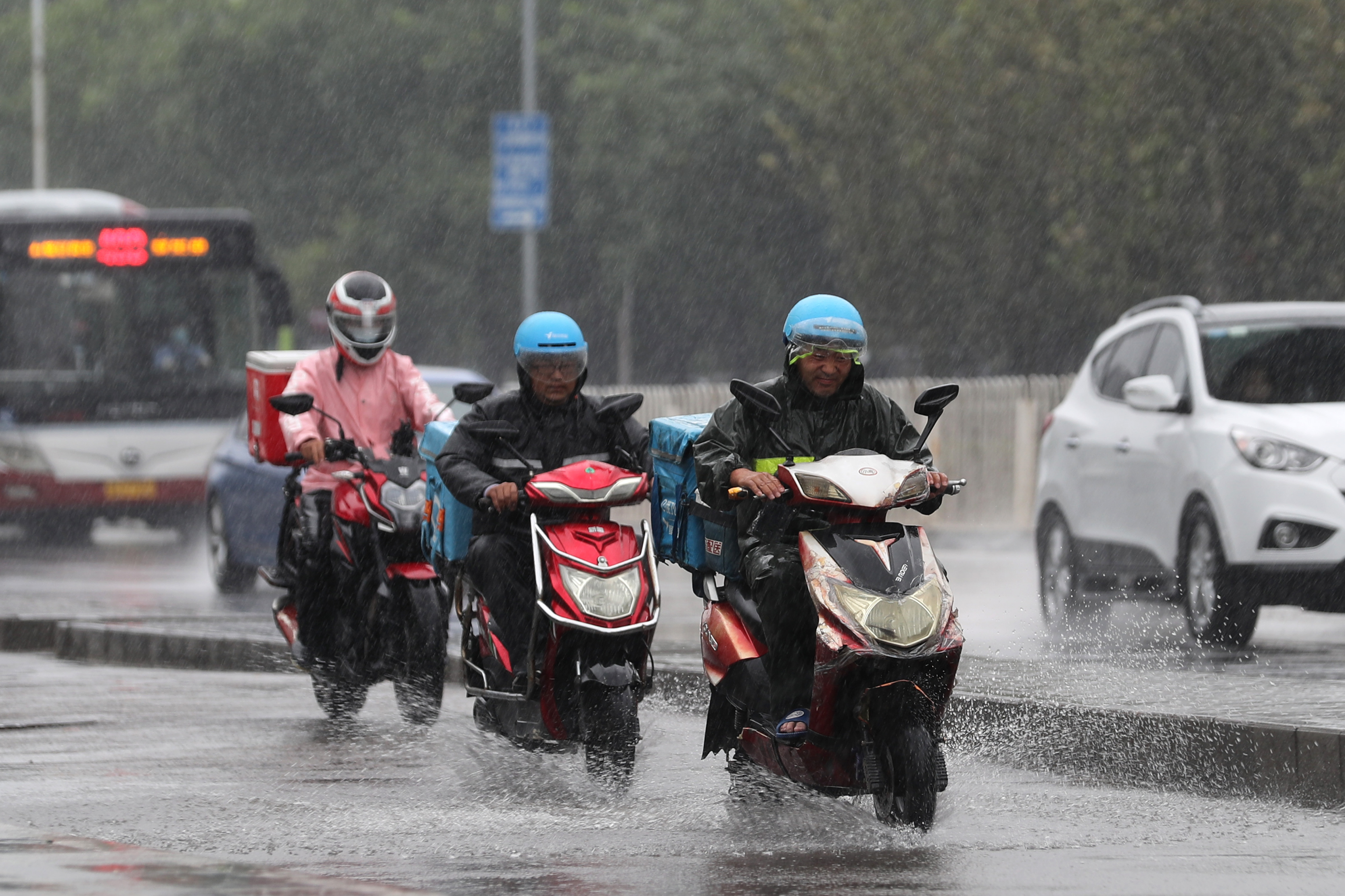 7月12日,北京市朝阳区,外卖员冒雨送餐。(中国日报记者 王壮飞 摄)