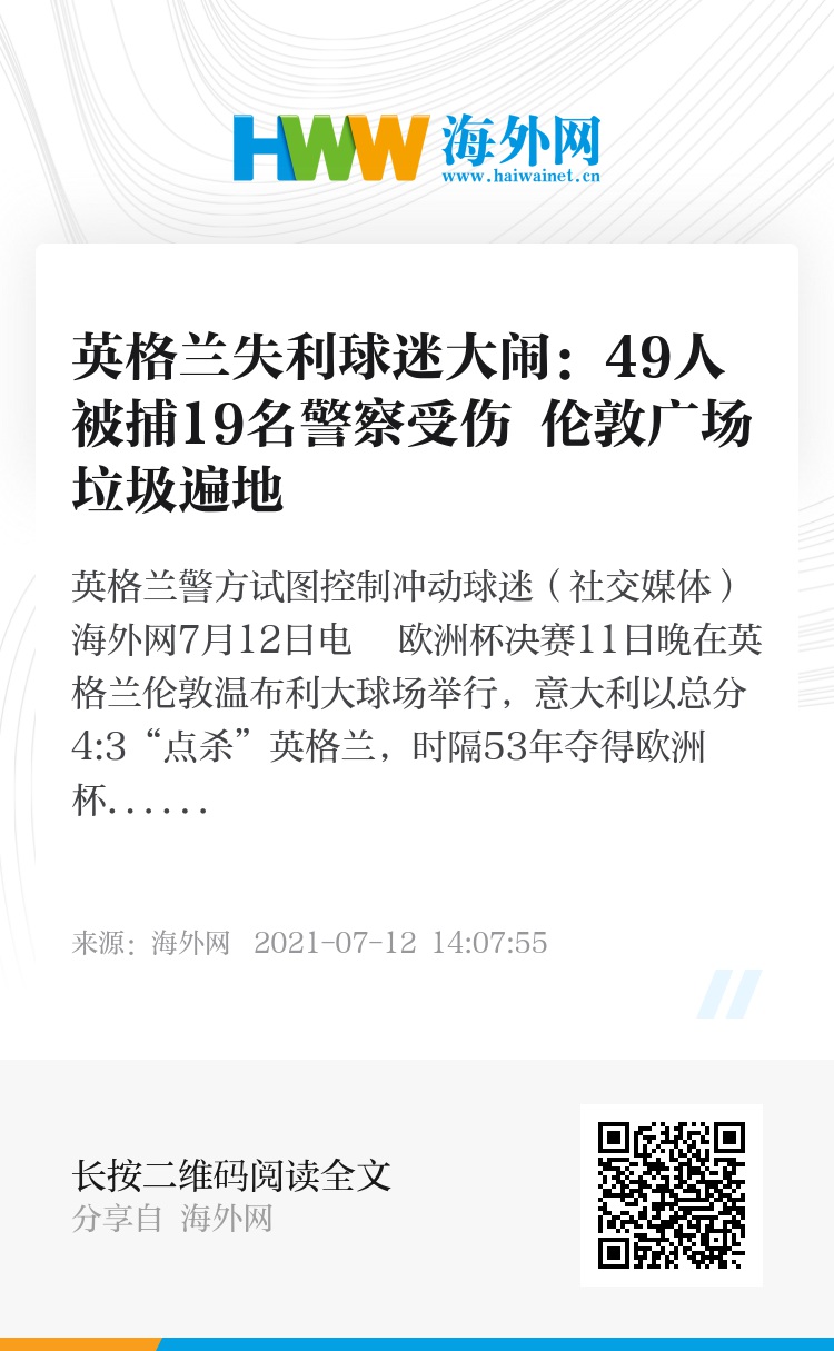 海外网7月12日电 欧洲杯决赛11日晚在英格兰伦敦温布利大球场举行,意大利以总分4:3“点杀”英格兰,时隔53年夺得欧洲杯冠军。据英国天空新闻网12日报道,英格兰失利招致一些球迷网友的种族主义辱骂,还有一些球迷的斗殴行为,49人因攻击性行为被捕、19名警察受伤。