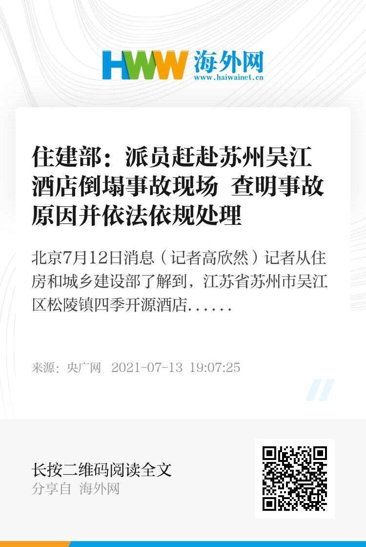 央广网北京7月12日消息(记者高欣然)记者从住房和城乡建设部了解到,江苏省苏州市吴江区松陵镇四季开源酒店发生部分房间倒塌事故发生后,住房和城乡建设部立即派员赶赴事故现场,指导帮助当地做好人员搜救、伤员救治等工作,查明事故原因并依法依规处理。