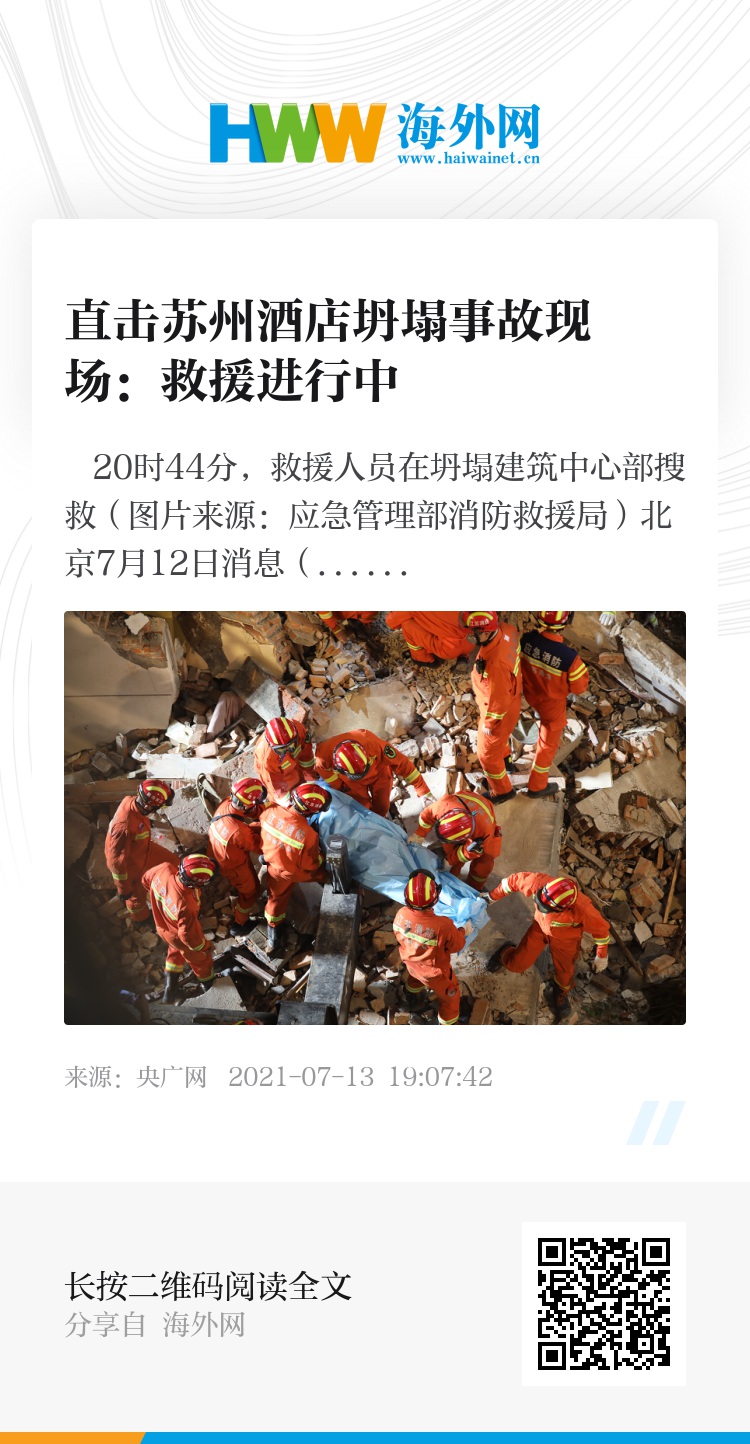 央广网北京7月12日消息(记者陈锐海)7月12日15时33分许,江苏省苏州市吴江区四季开源酒店辅房发生坍塌,当地消防救援队伍立即赶赴现场救援。截至12日18时40分,现场已救出被困人员8人,其中1人死亡。另有失联人员10人。目前,搜救工作仍在进行中。
