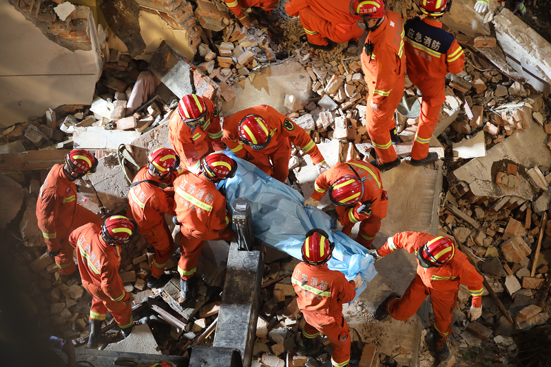 20时45分,救援人员搜救出一名被困人员,正送往医院治疗(图片来源:应急管理部消防救援局)