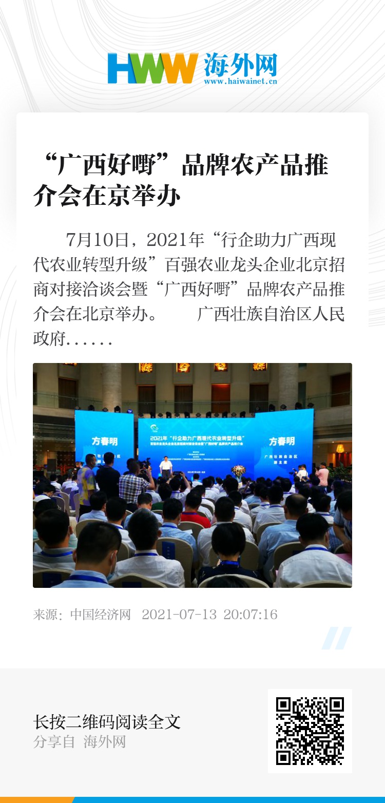 7月10日,2021年“行企助力广西现代农业转型升级”百强农业龙头企业北京招商对接洽谈会暨“广西好嘢”品牌农产品推介会在北京举办。