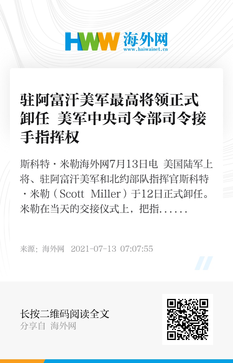 报道称,米勒正式卸任,标志着美军结束长达20年的阿富汗战争任务。麦肯齐接手监督美军的最后撤退,他仍可在8月31日撤军完成前,授权美军在阿行动。