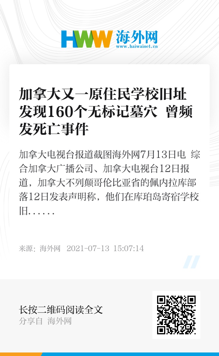 据加拿大媒体介绍,这所寄宿学校开办于1890年到1970年之间,那里发生过许多恐怖事件。加拿大原住民寄宿学校历史和对话中心网站显示,1896年,库珀岛寄宿学校一项调查显示,264名学生中有107人死亡。1950年,两姐妹试图逃跑时溺水身亡,1966年还有1名学生自杀身亡。(海外网 张琪)