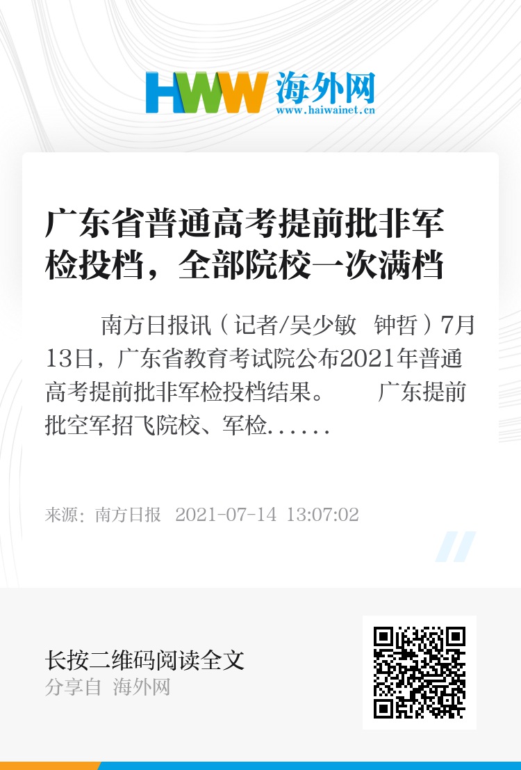 南方日报讯(记者/吴少敏 钟哲)7月13日,广东省教育考试院公布2021年普通高考提前批非军检投档结果。