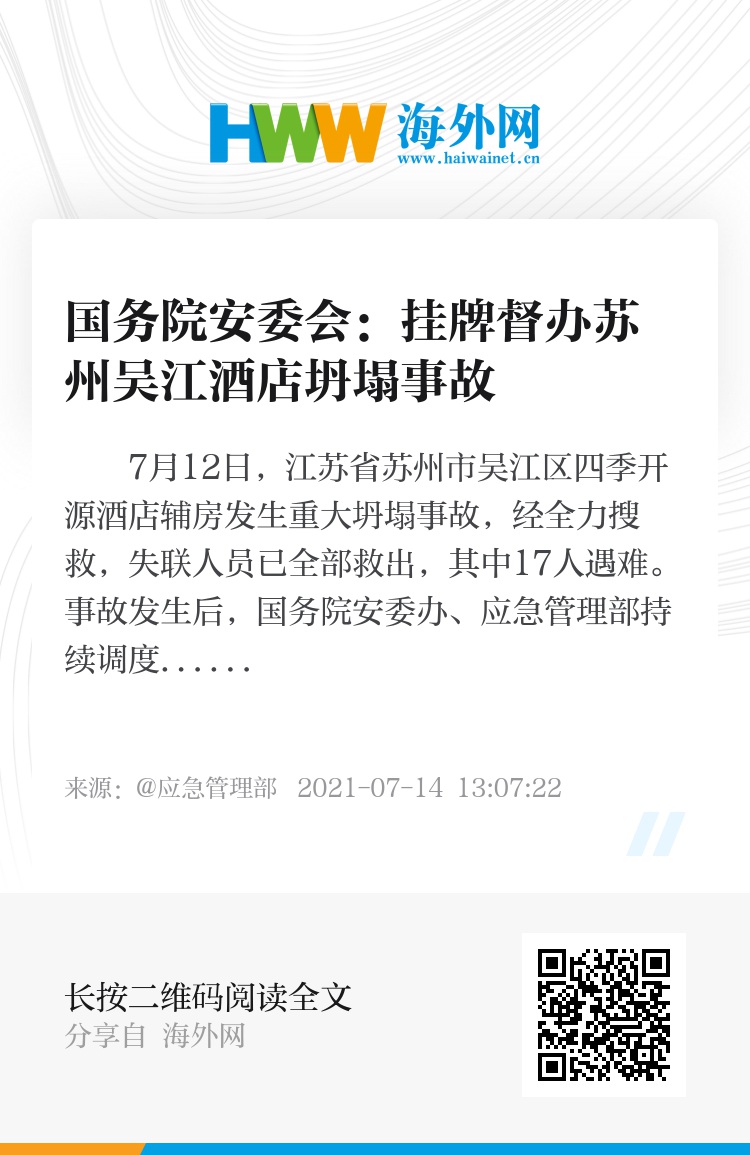 7月12日,江苏省苏州市吴江区四季开源酒店辅房发生重大坍塌事故,经全力搜救,失联人员已全部救出,其中17人遇难。事故发生后,国务院安委办、应急管理部持续调度现场救援处置进展,派出部总工程师带队的工作组赶赴现场指导救援处置工作。国务院安委会决定成立督办组对该起事故查处进行挂牌督办。