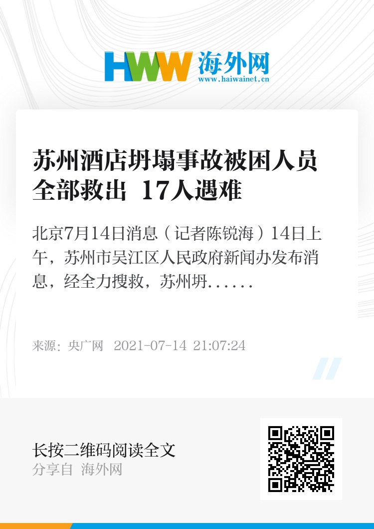 央广网北京7月14日消息(记者陈锐海)14日上午,苏州市吴江区人民政府新闻办发布消息,经全力搜救,苏州坍塌酒店现场失联人员已全部救出,共搜寻出被困人员23人。其中,1人无伤已回家,5名受伤人员经救治生命体征平稳,17人遇难。截至7月14日9时,搜救工作全部结束。