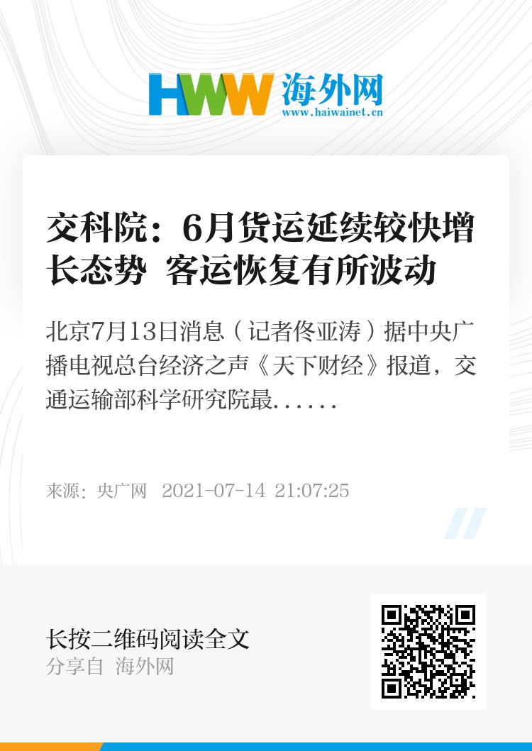 央广网北京7月13日消息(记者佟亚涛)据中央广播电视总台经济之声《天下财经》报道,交通运输部科学研究院最新发布的中国运输生产指数显示,6月总体呈现“货运延续较快增长态势、客运恢复有所波动”的运行特点。