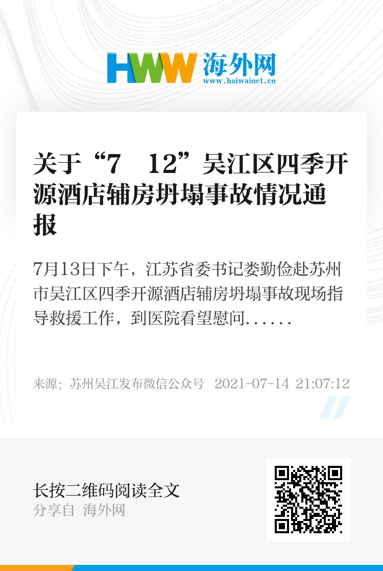 7月13日下午,江苏省委书记娄勤俭赴苏州市吴江区四季开源酒店辅房坍塌事故现场指导救援工作,到医院看望慰问受伤人员,并研究部署救援和后续处置相关工作。