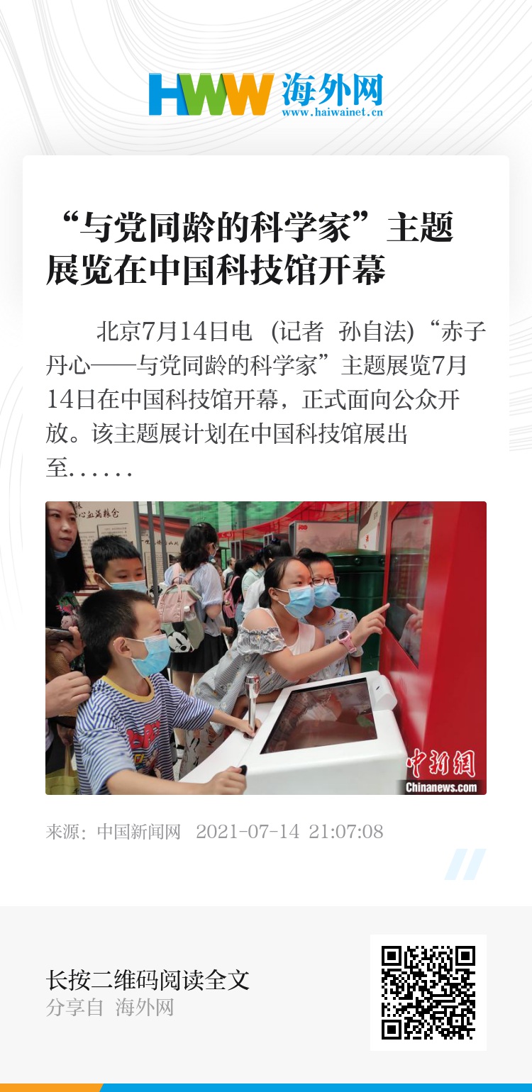 中新网北京7月14日电 (记者 孙自法)“赤子丹心——与党同龄的科学家”主题展览7月14日在中国科技馆开幕,正式面向公众开放。该主题展计划在中国科技馆展出至10月初,后期将启动多地巡展。