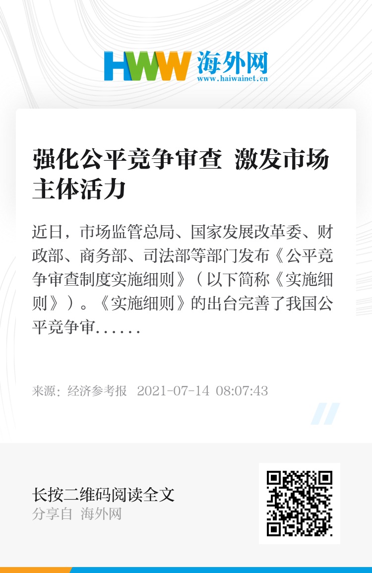 近日,市场监管总局、国家发展改革委、财政部、商务部、司法部等部门发布《公平竞争审查制度实施细则》(以下简称《实施细则》)。《实施细则》的出台完善了我国公平竞争审查制度,强化了竞争政策基础地位,是我国建设高标准市场体系、落实推动高质量发展的重要制度保障。