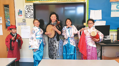 邱增慧(中)教外国小朋友学习中国传统乐器。