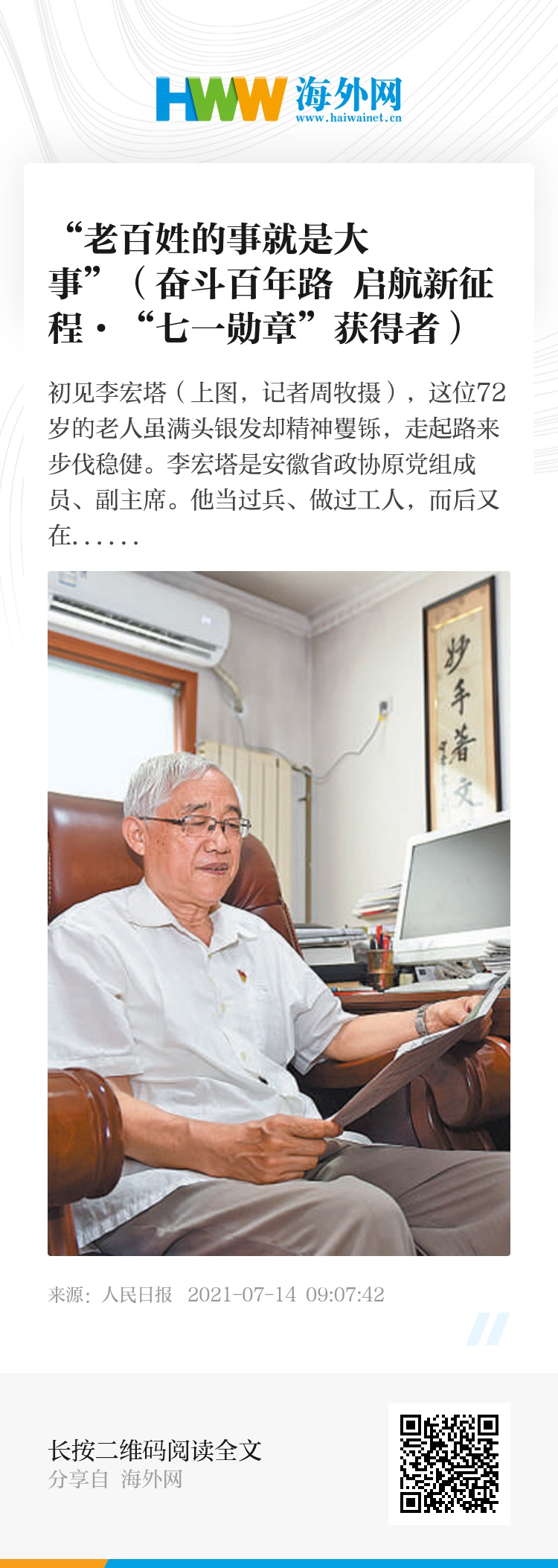 初见李宏塔(上图,新华社记者周牧摄),这位72岁的老人虽满头银发却精神矍铄,走起路来步伐稳健。李宏塔是安徽省政协原党组成员、副主席。他当过兵、做过工人,而后又在共青团、民政、政协等系统工作。他传承红色家风,始终艰苦朴素、清正廉洁、以严治家,在工作生活中始终与群众想在一起、干在一处,是党员领导干部忠诚干净担当的典范。