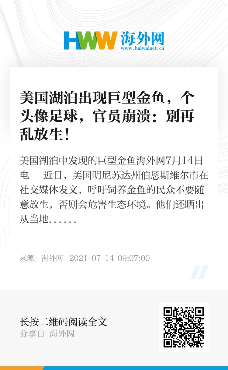 海外网7月14日电 近日,美国明尼苏达州伯恩斯维尔市在社交媒体发文,呼吁饲养金鱼的民众不要随意放生,否则会危害生态环境。他们还晒出从当地湖泊发现的巨型金鱼,其个头有足球大小,令网民大吃一惊。