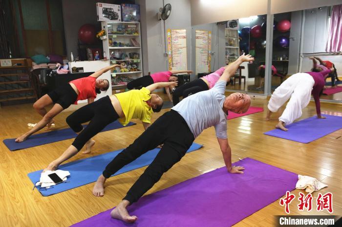 在清一色女学员的瑜伽馆里,个子不高,剃光头发,眉毛花白的莫斯法,是唯一一名男性,也是年纪最大的学员。伴随着音乐,莫斯法和他的“同学”踩着节拍做出瑜伽的各种体式,流畅程度、完成度不输年轻学员。