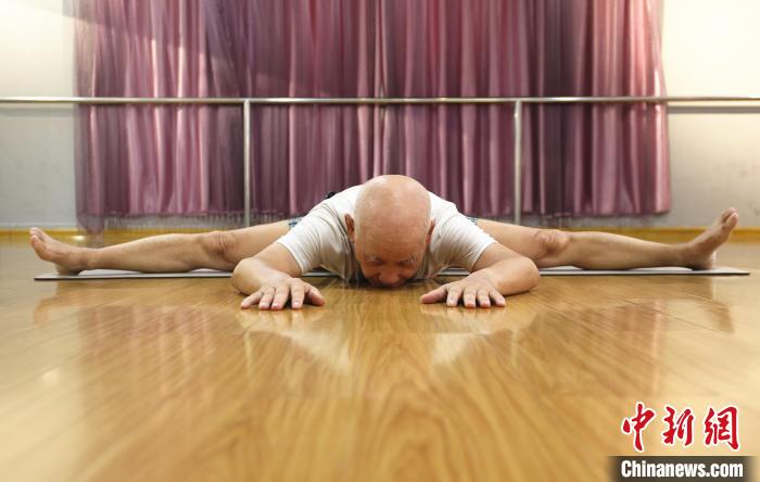 中新网柳州7月14日电 (朱柳融)手撑地腿悬空、秀出一字马……许多年轻人都做不到的瑜伽体式,7月14日在广西柳州市柳江区的一家瑜伽馆,84岁的退休教师莫斯法轻松就可完成。
