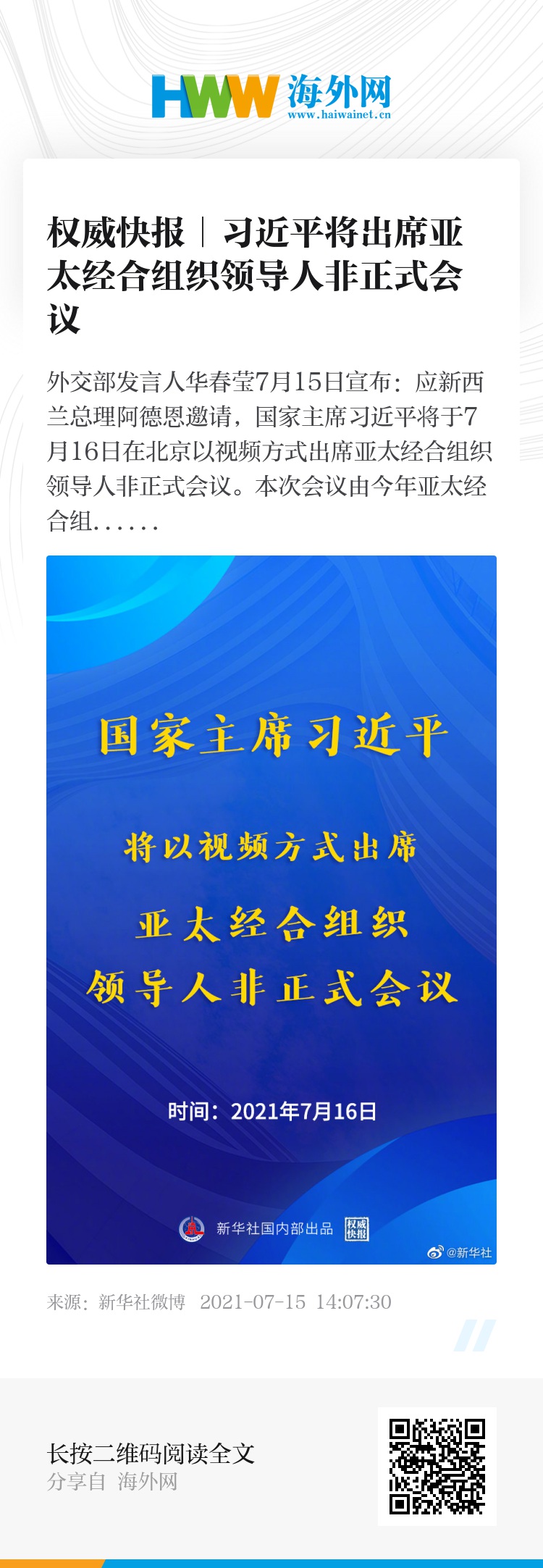 外交部发言人华春莹7月15日宣布:应新西兰总理阿德恩邀请,国家主席习近平将于7月16日在北京以视频方式出席亚太经合组织领导人非正式会议。本次会议由今年亚太经合组织东道主新西兰倡议召开,主题为“新冠肺炎疫情背景下亚太地区如何把握机遇,合作应对卫生危机,加速经济复苏,为未来发展打下更好基础”。