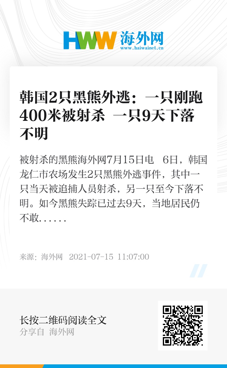 海外网7月15日电 6日,韩国龙仁市农场发生2只黑熊外逃事件,其中一只当天被追捕人员射杀,另一只至今下落不明。如今黑熊失踪已过去9天,当地居民仍不敢出门。